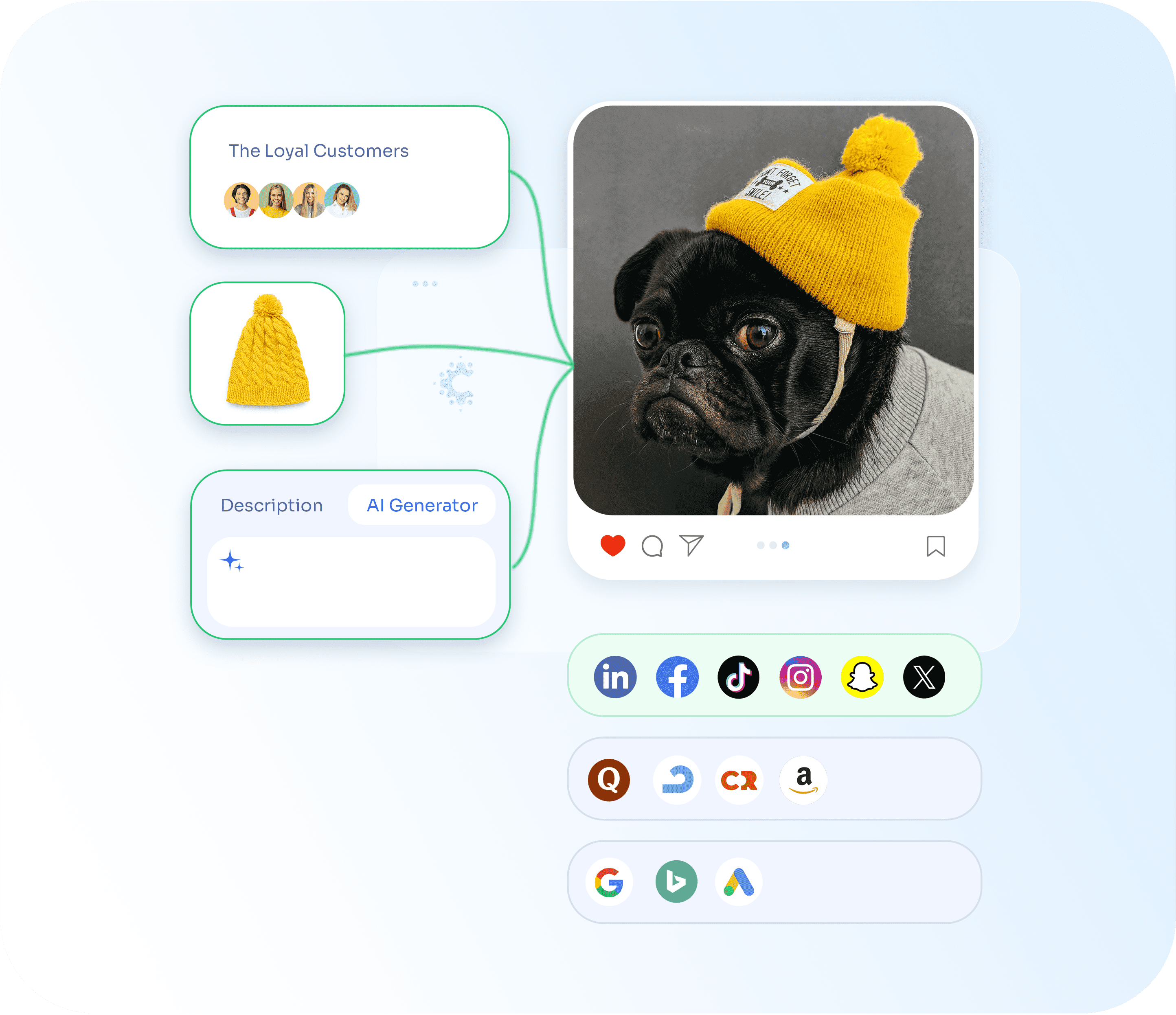 Efficiently launch unified, consistent marketing campaigns across supported Digital Ad and Direct Messaging channels, saving you time and money on content creation, campaign management, and media buying.
