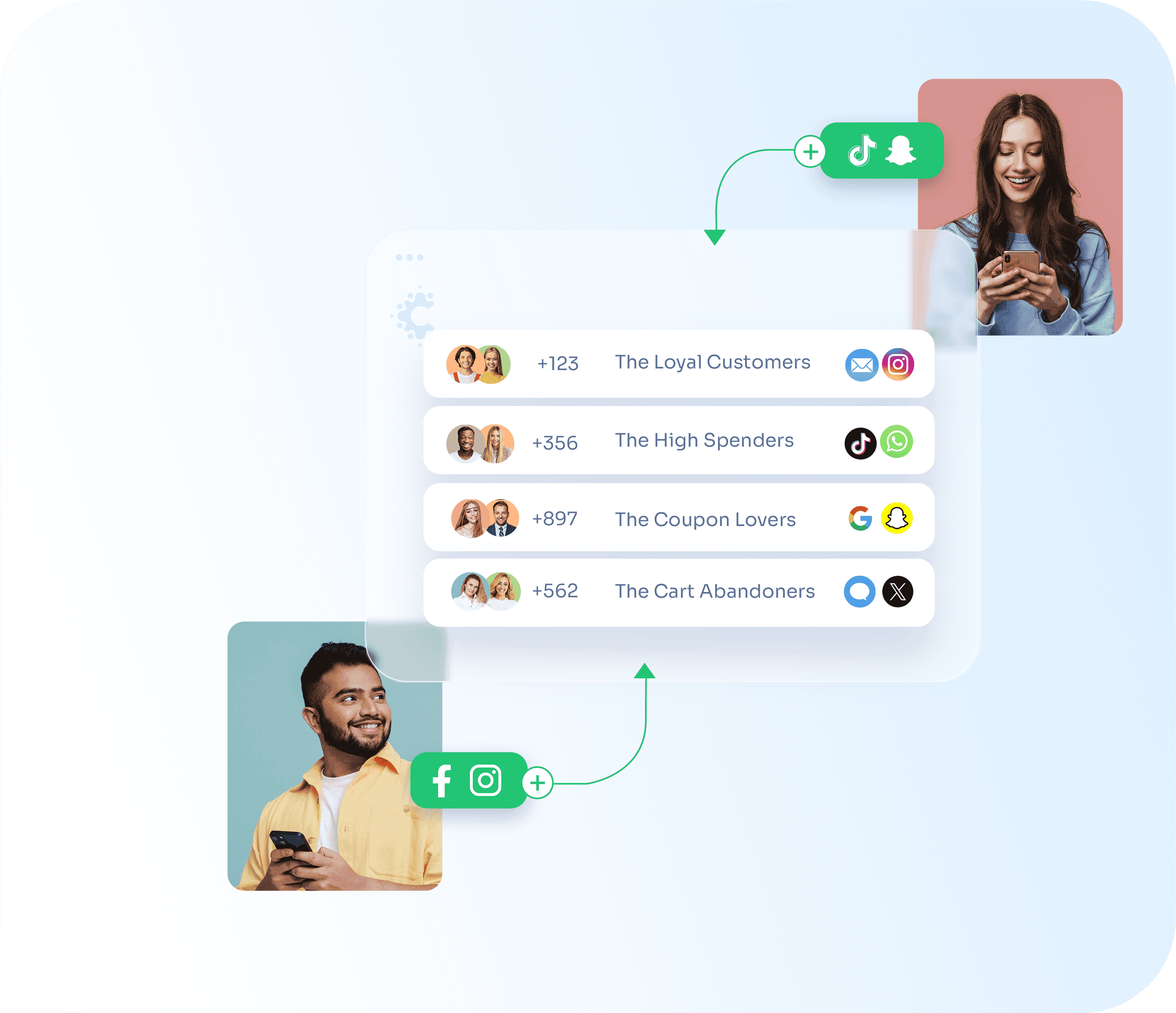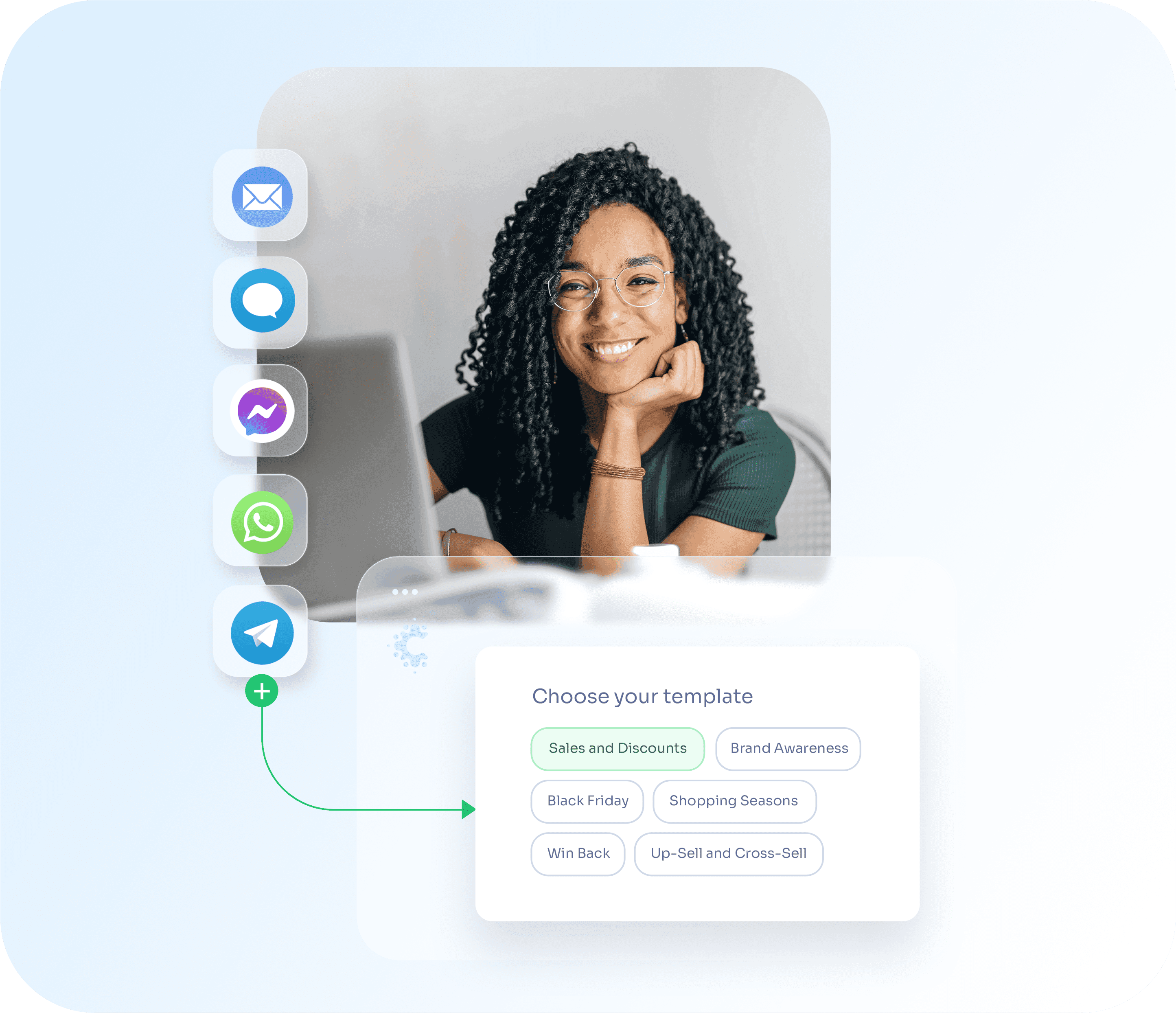 Communicate with existing customers across multiple channels (Email, SMS, push notifications, messaging platforms, etc.) in a highly personalized and targeted manner.